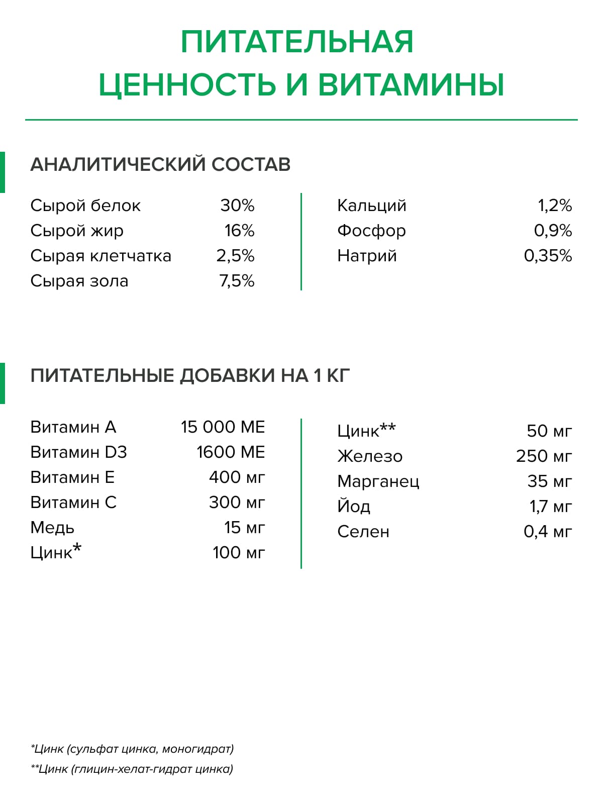 Питательные добавки на 1 кг: витамин А 15 000 МЕ, витамин D3 1600 МЕ, витамин Е 400 мг, витамин С 300 мг, медь (пентагидрат сульфата меди (II)) 15 мг, цинк (сульфат цинка, моногидрат) 100 мг, цинк (глицин-хелат-гидрат цинка (твердый)) 50 мг, железо (моногидрат сульфата железа (II)) 250 мг, марганец (моногидрат сульфата марганца (II)) 35 мг, йод (как йодат кальция, безводный) 1,7 мг, селен (селенит натрия) 0,4 мг.