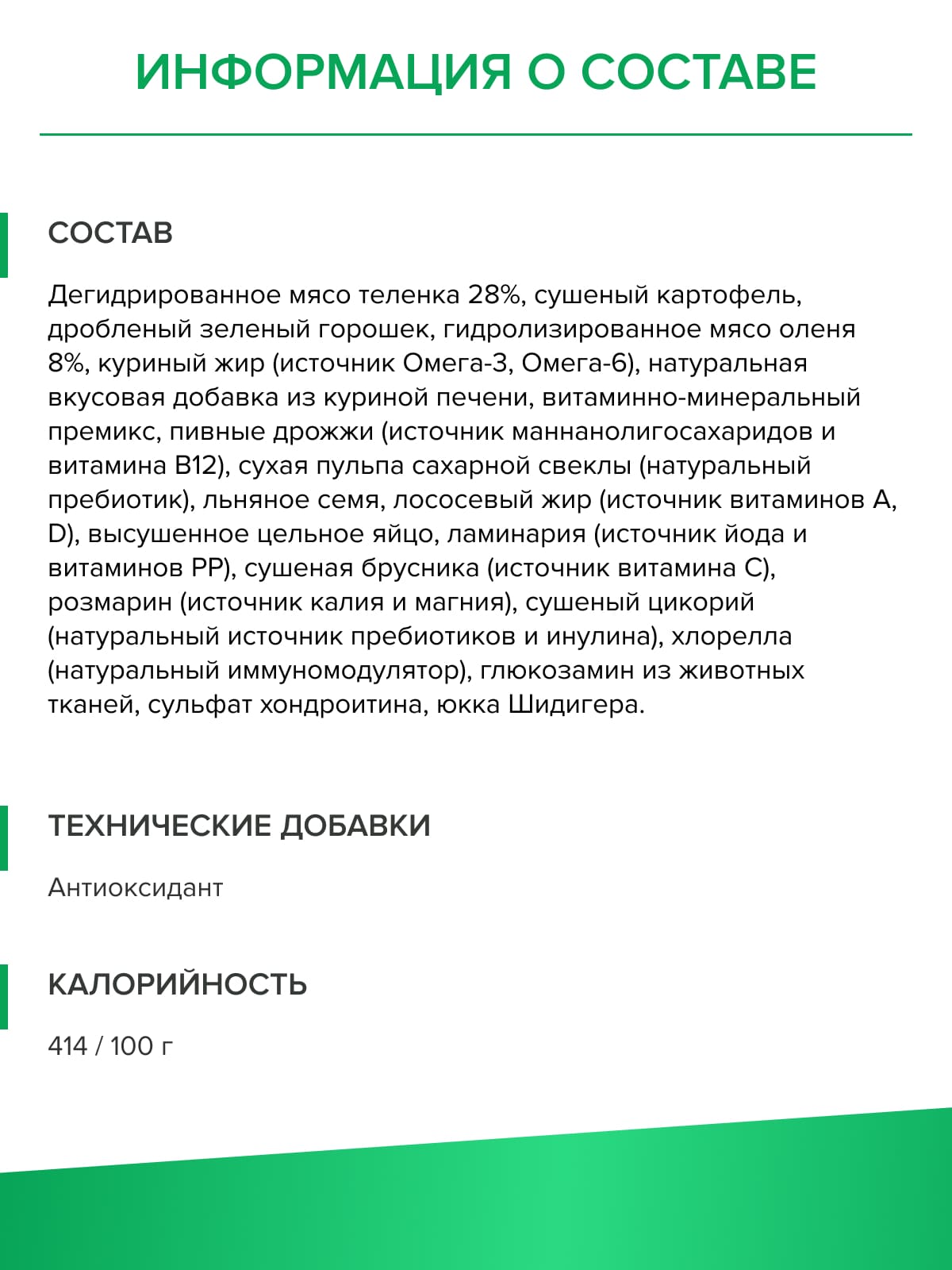 Аналитический состав: сырой белок 30%, сырой жир 16%, сырая клетчатка 2,5%, сырая зола 7,5%, кальций 1,2%, фосфор 0,9%, натрий 0,35%.