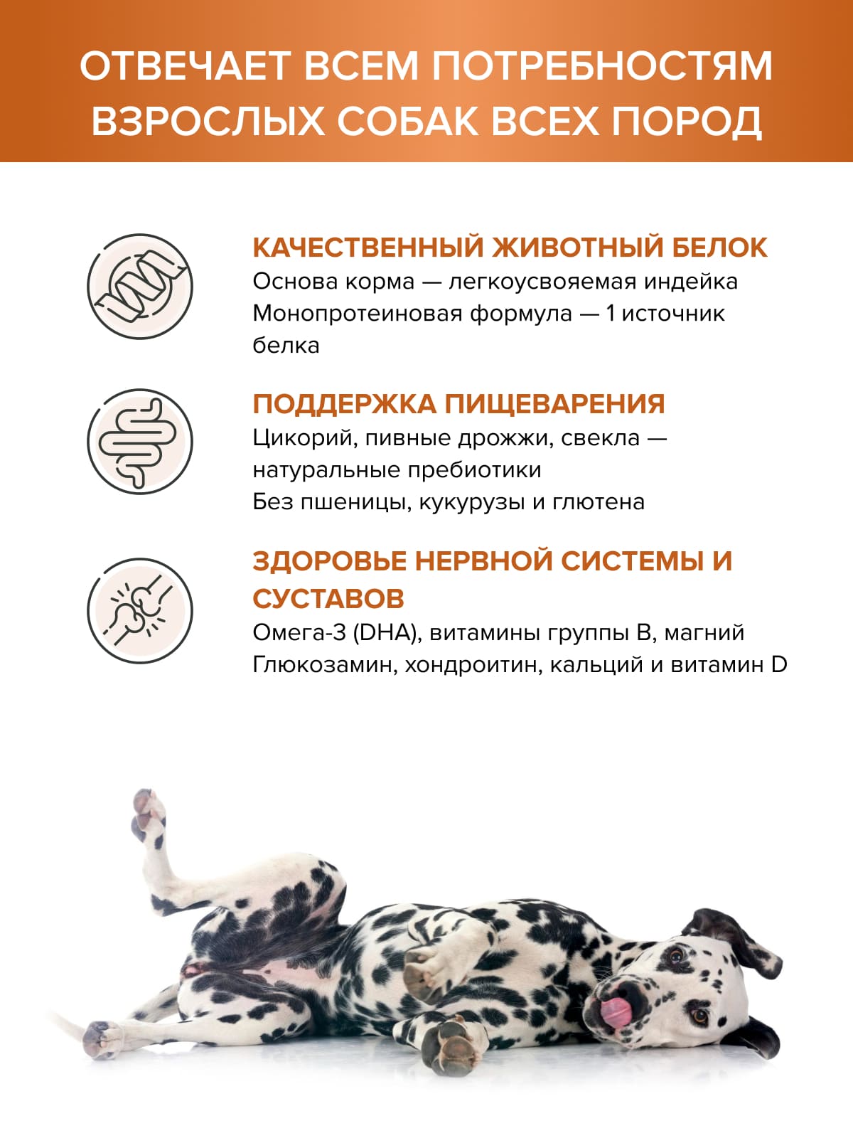 Состав: дегидрированное мясо индейки (20%), ячмень, цельно-зерновой белый рис, мясо индейки гидролизованное (4%), куриный жир (источник жирных кислот Омега-6), гидролизованная куриная печень, сухая пульпа сахарной свеклы (натуральный пребиотик), витаминно-минеральный комплекс, масло подсолнуха холодного отжима, лососевый жир (источник витаминов A, D), льняное семя, пивные дрожжи (натуральный источник пребиотиков маннанолигосахаридов и витамина B12), сушёный цикорий (натуральный источник пребиотика инулин), ламинария (источник йода и витамина PP), глюкозамин из животных тканей, сульфат хондроитина.