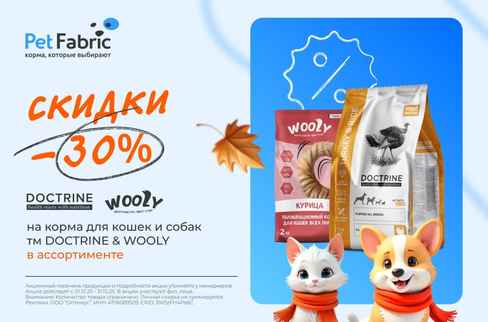 —30% скидка на сухие корма DOCTRINE и WOOLY