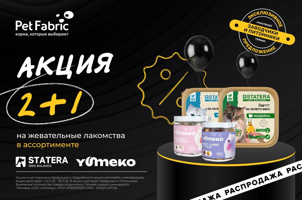 Черная пятница! Акция для заводчиков 2+1 на лакомства и паштеты брендов YUMEKO и STATERA